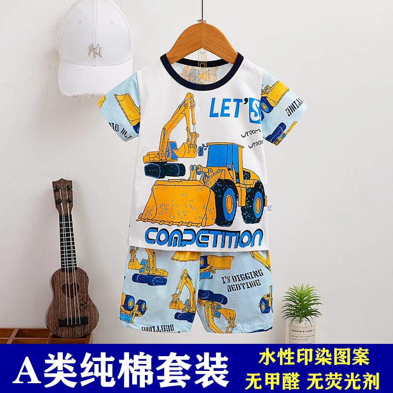 2024夏季兒童睡衣純棉男童工程車挖掘機吊車卡車T汽車家居服男寶