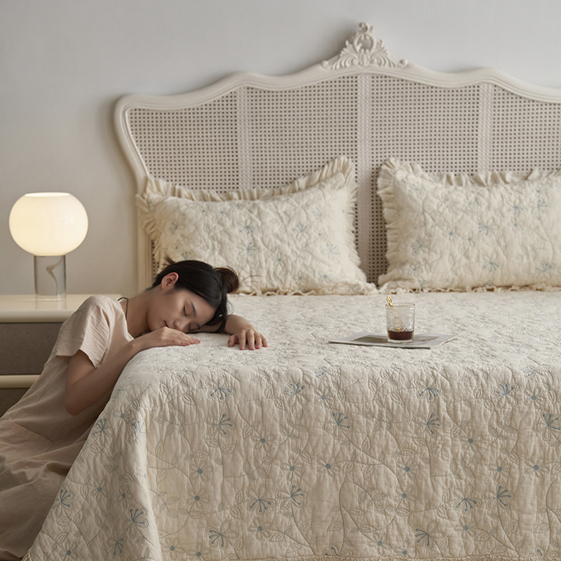 法式復古鈴蘭三層紗提花棉麻床蓋三件套雙面絎縫夾棉防滑床單1.8M