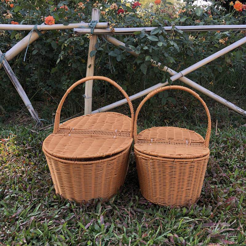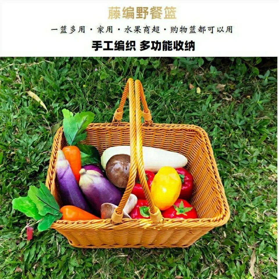 手提籃清潔工具籃塑料藤編戶外野餐籃帶蓋商超零食水果買菜購物籃