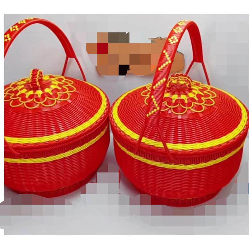 純手工編織婚慶用品結婚喜籃子手提帶蓋籃藤編織筐拜神籃收納成品