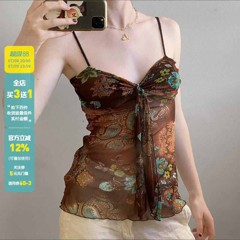 WEEKEEP 中古小眾印花綁帶設計吊帶背心女古著感外穿網紗修身上衣