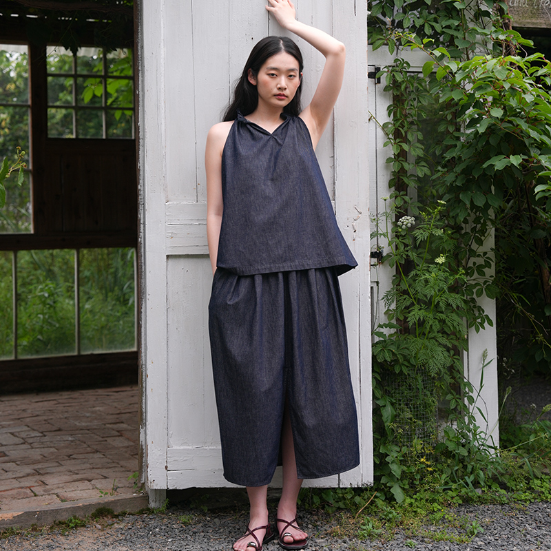 ItoshIroshI深靛藍環保水洗桑蠶絲麻棉混紡削肩顯瘦木耳邊A型上衣