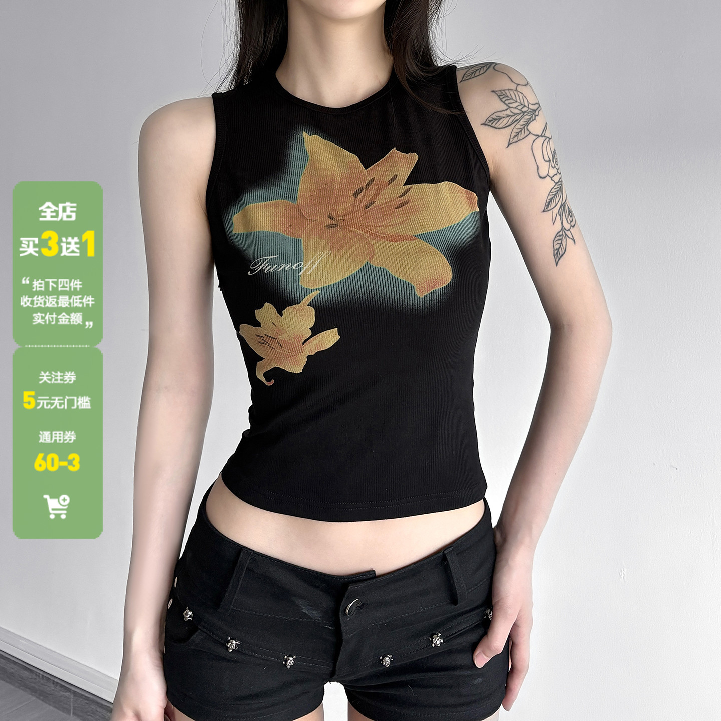 WEEKEEP 辣妹小眾植物花卉印花螺紋針織無袖背心百搭修身顯瘦上衣