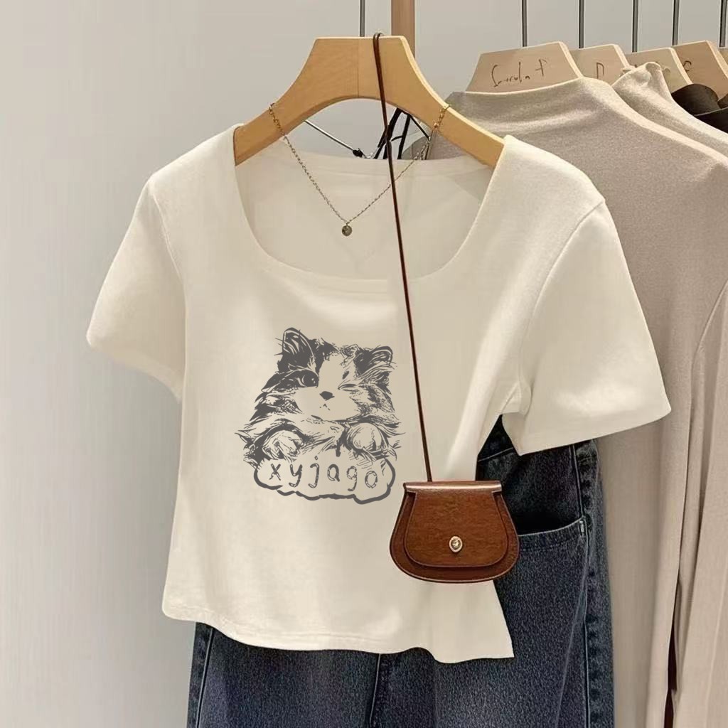 高級感白色純棉短袖t恤女夏季設計感小眾u領修身短款正肩短款上衣