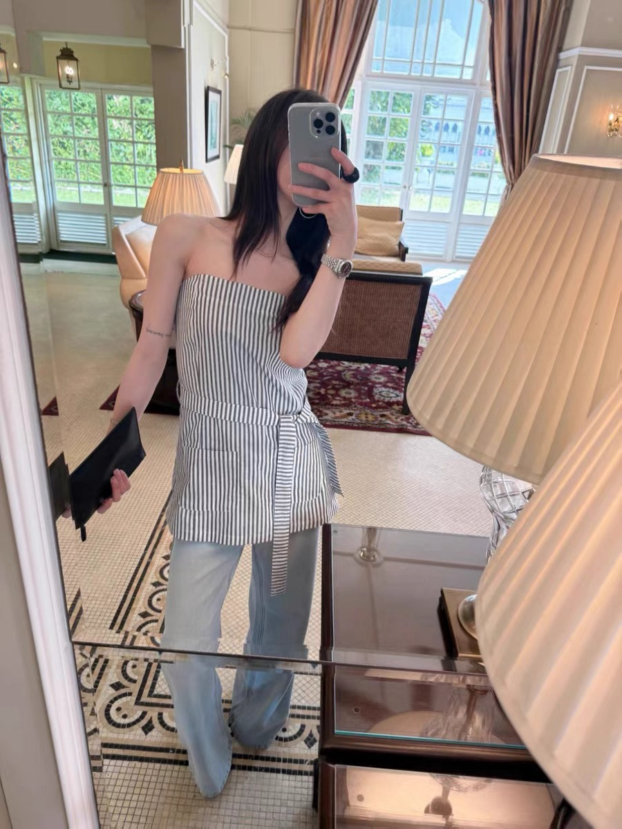 AII-in韓系時髦條紋抹胸背心女夏季設計感系帶修身顯瘦無袖上衣