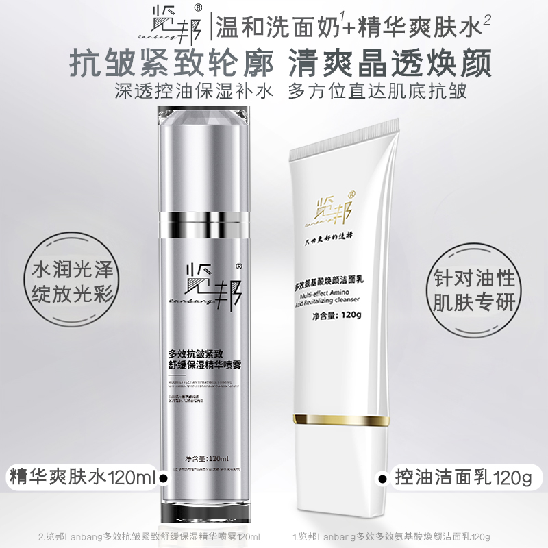 覽邦潔面護膚套裝溫和潔面乳120g+抗皺緊致舒緩精華水120ml送男女
