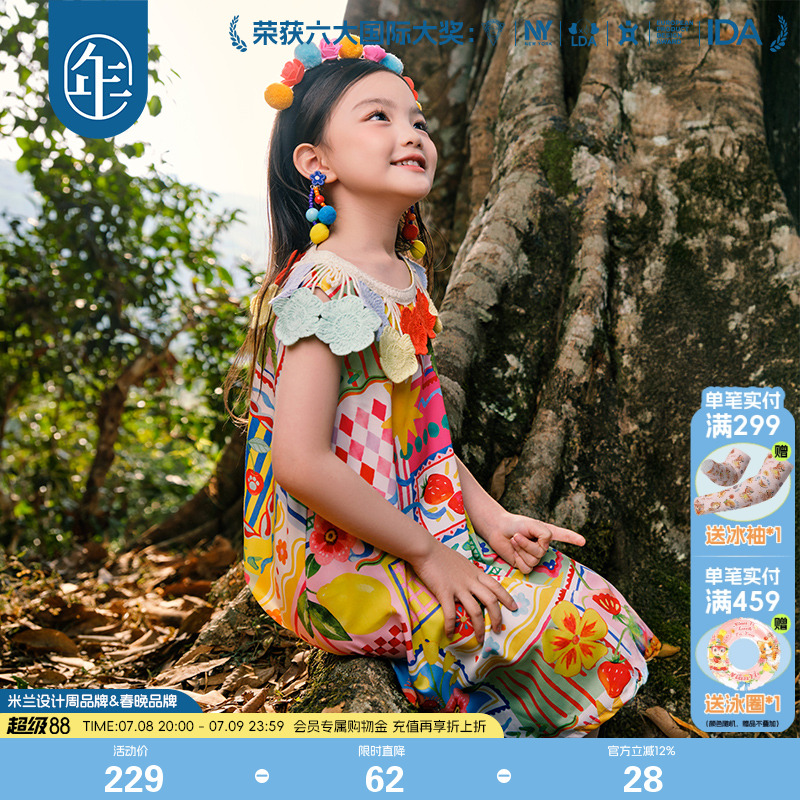 笛莎官旗童裝女童連衣裙2025夏季新款大童女孩寶寶兒童印花棉布裙