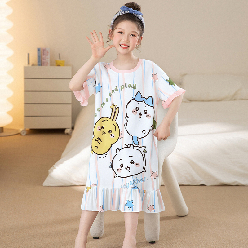 女童睡裙綿綢夏季棉綢兒童薄款短袖寶寶小孩大睡衣2025新款家居服