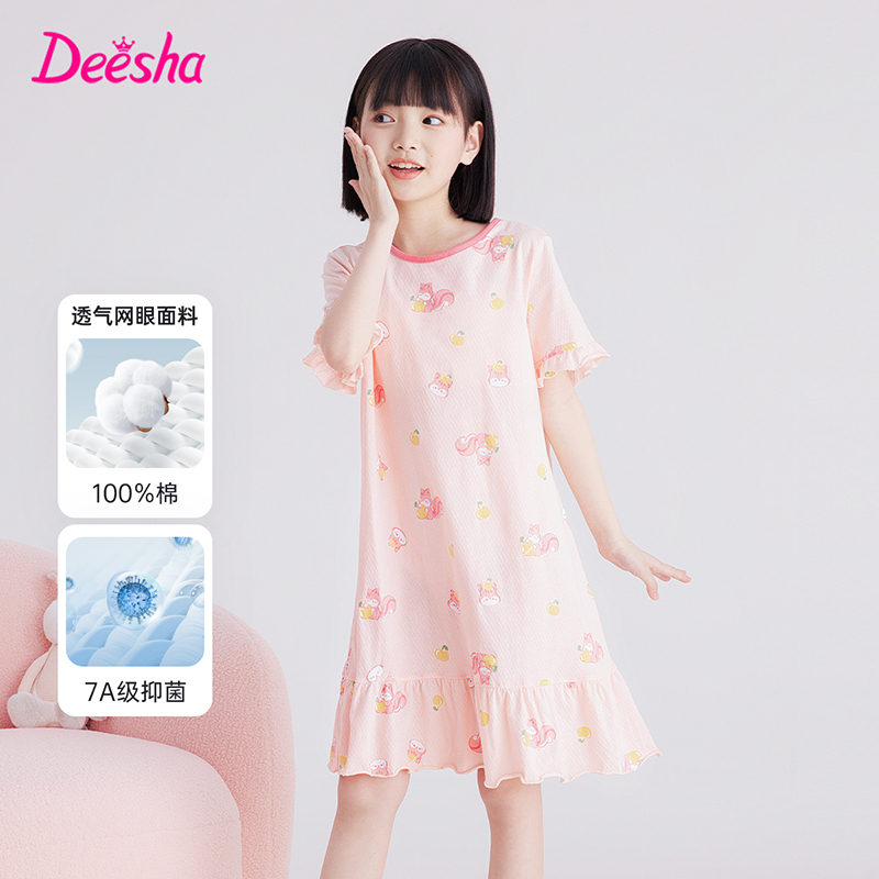 笛莎女童睡裙純棉短袖2025新款網眼中長款夏季薄款中大童全棉睡衣
