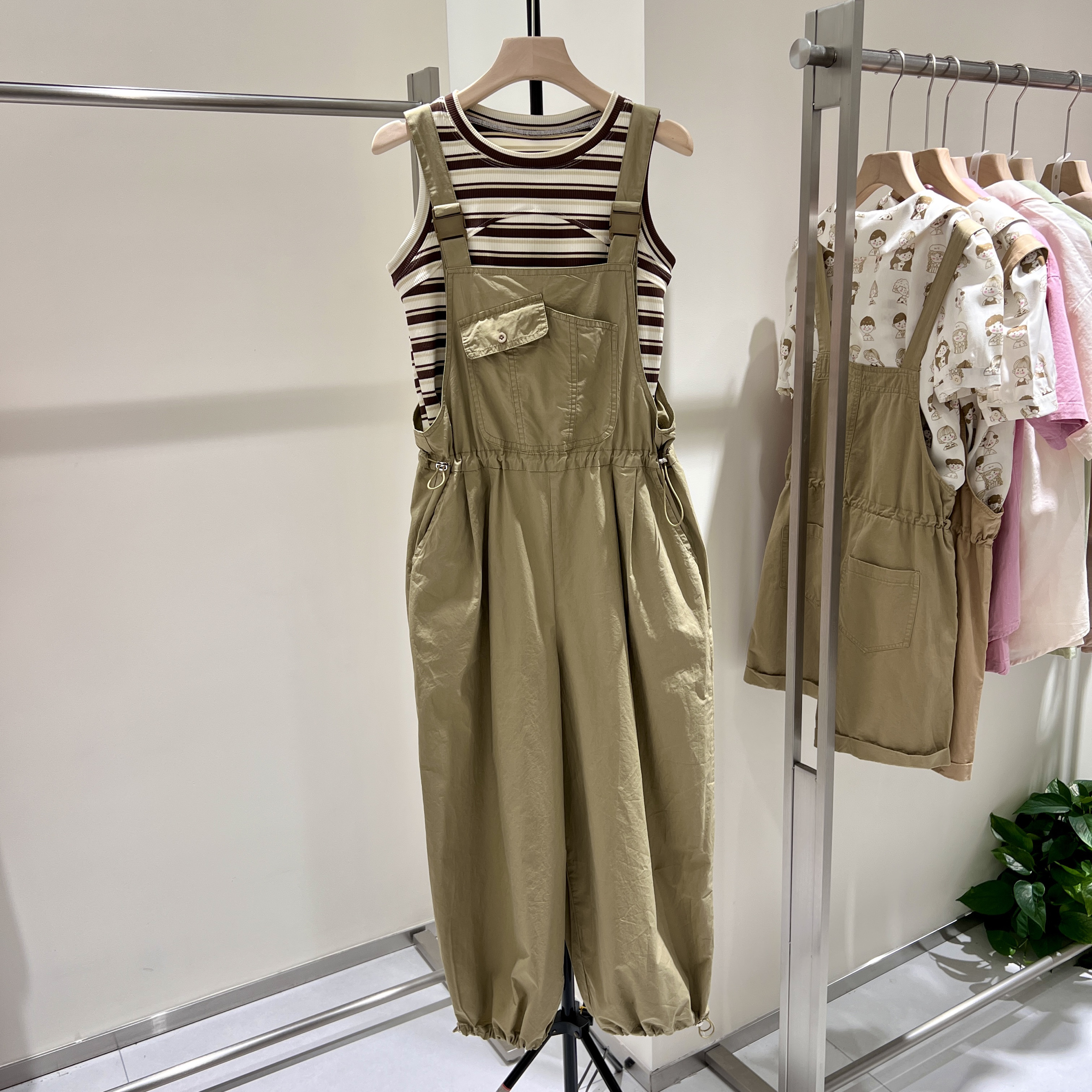 條紋無袖T恤+美式休閑背帶褲女2025夏新抽繩收腰工裝褲兩件套裝
