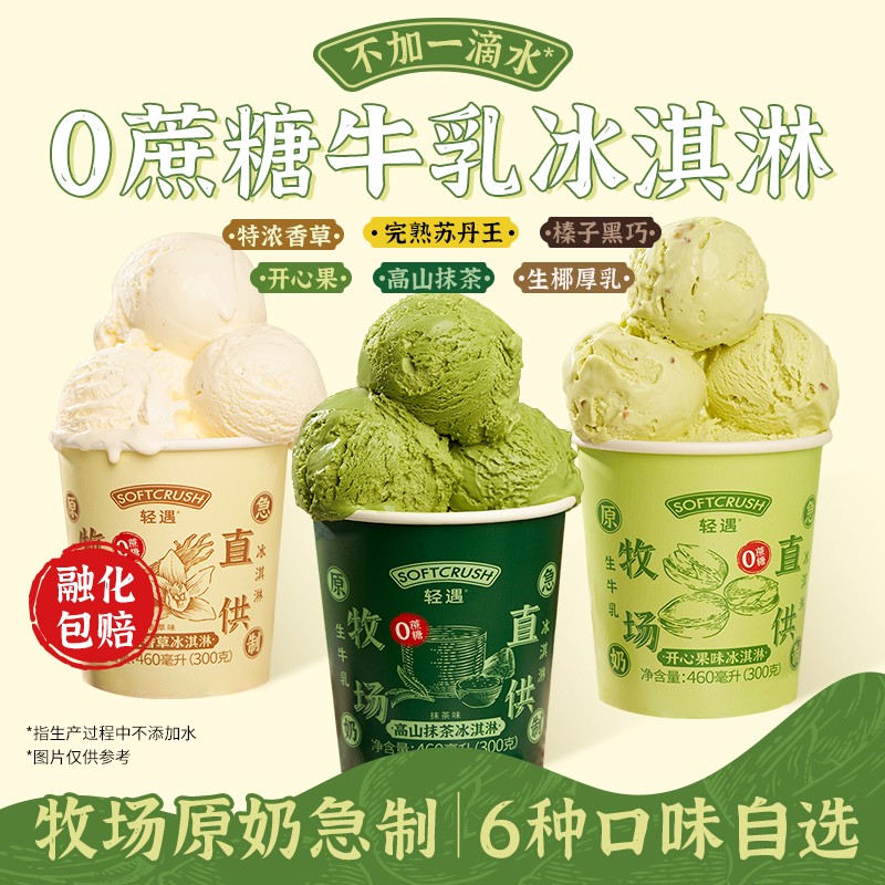 0蔗糖輕遇0蔗糖牧場直供鮮牛乳冰淇淋雪糕冷飲460ML*3桶裝