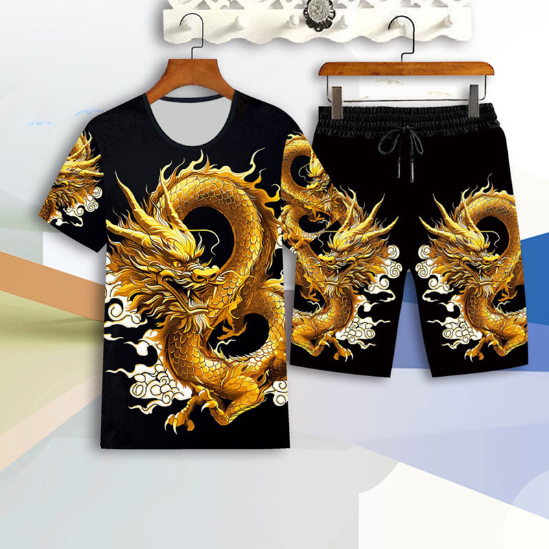 網紅爆款國潮短袖夏潮流中國龍短袖短褲套裝民族風男裝單件/套裝