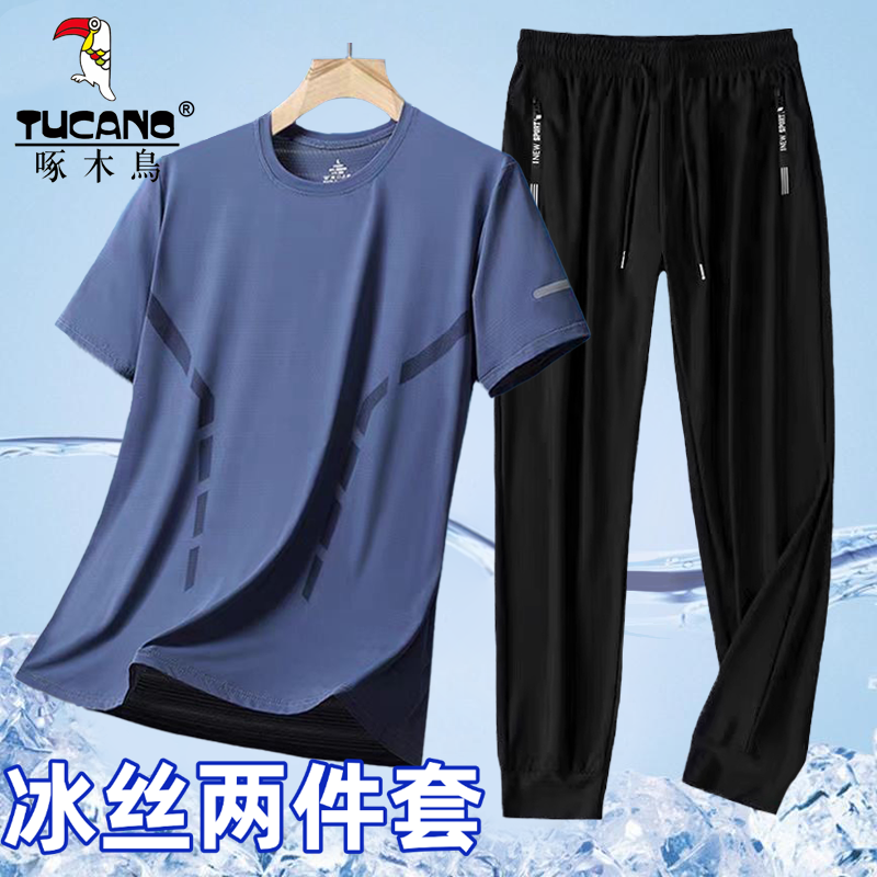 啄木鳥休閑運動套裝男士夏季新款冰絲短袖t恤長褲兩件套短袖套裝