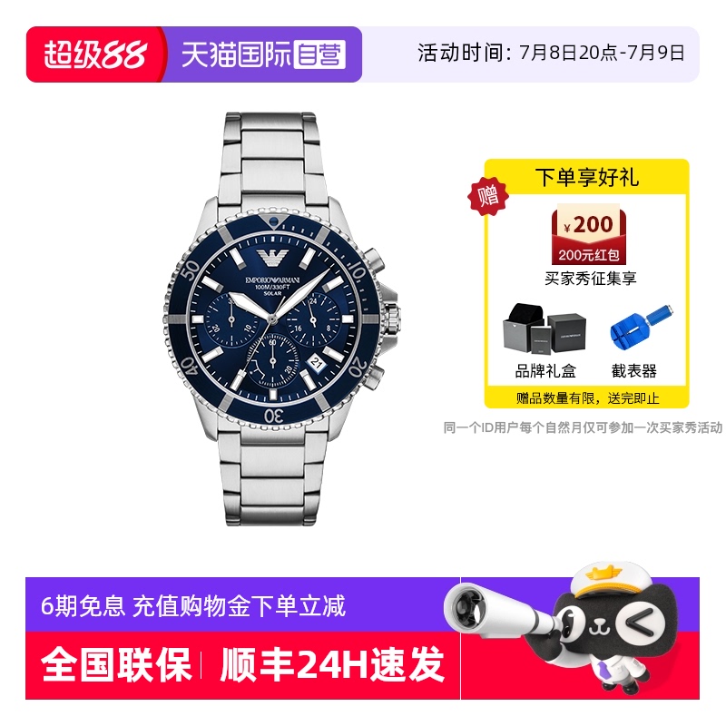 【自營】Armani阿瑪尼水鬼男表三眼計時太陽能手表明星款AR11681