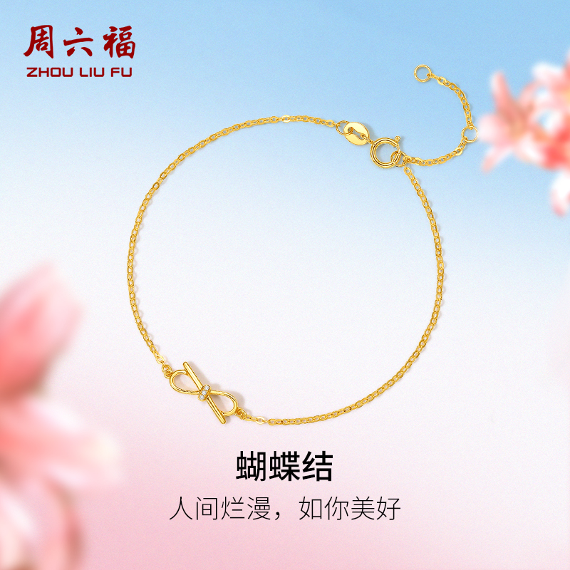 周六福18K黃金鉆石手鏈女天然真鉆璀璨蝴蝶結au750官方手飾禮物