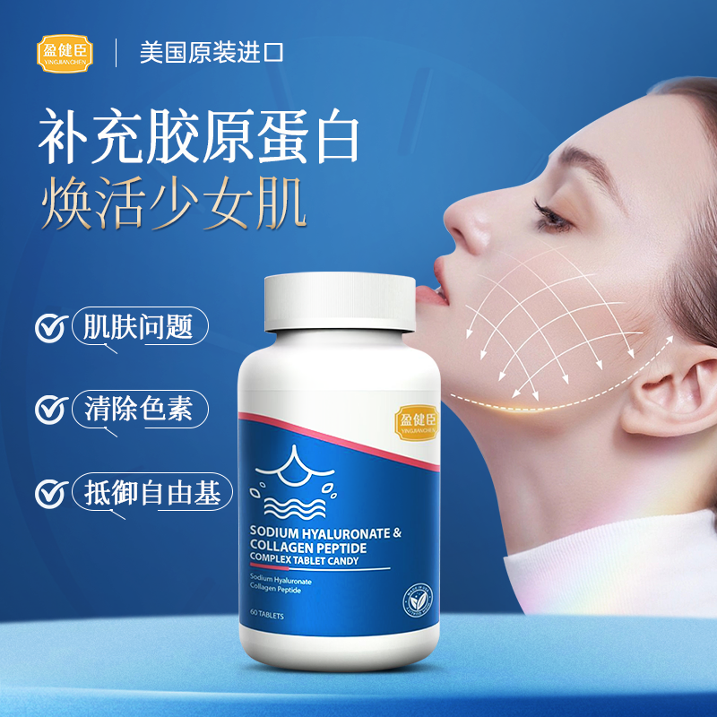 盈健臣透明質酸鈉膠原蛋白肽復合片保濕肌膚彈潤緊致煥白60片/瓶