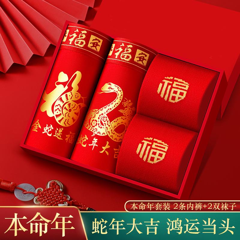 男士純棉內褲蛇年中腰棉質平角褲頭本命年紅色結婚新年短褲頭男