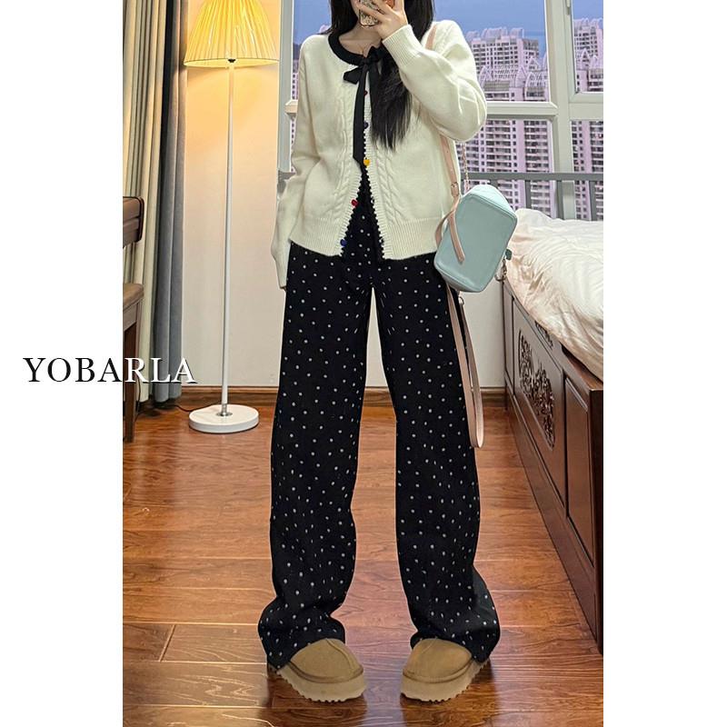 黑色波點休閑褲女夏季薄款高腰大碼胖mm寬松顯瘦梨形身材闊腿褲子