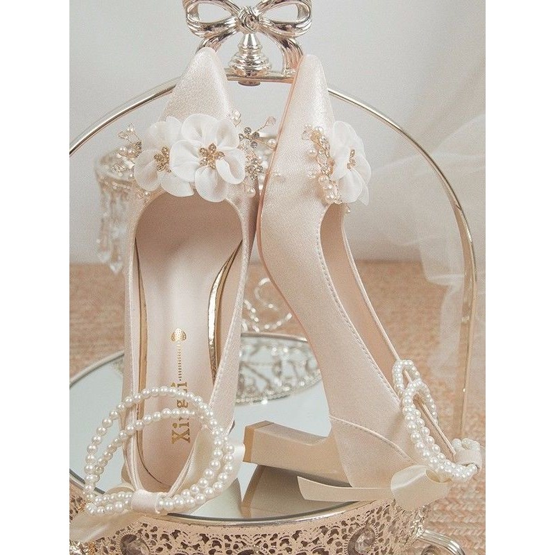 粗跟高跟鞋不累腳2024新款訂婚花朵婚J鞋新娘鞋主婚紗婚禮服水晶