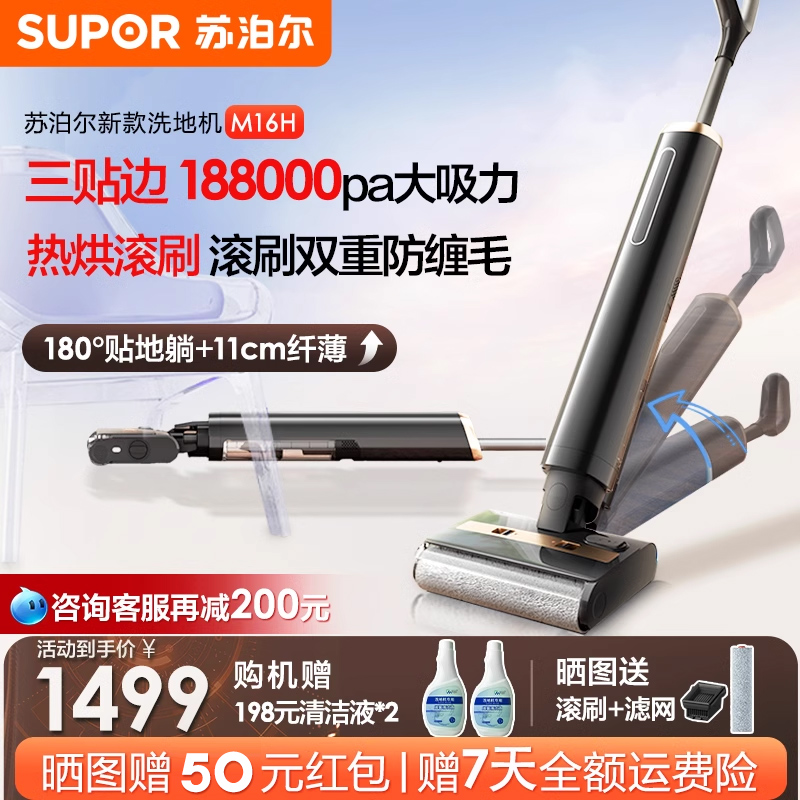 蘇泊爾洗地機無線吸拖一體熱烘干除菌三貼邊拖把家用自動清潔M16H