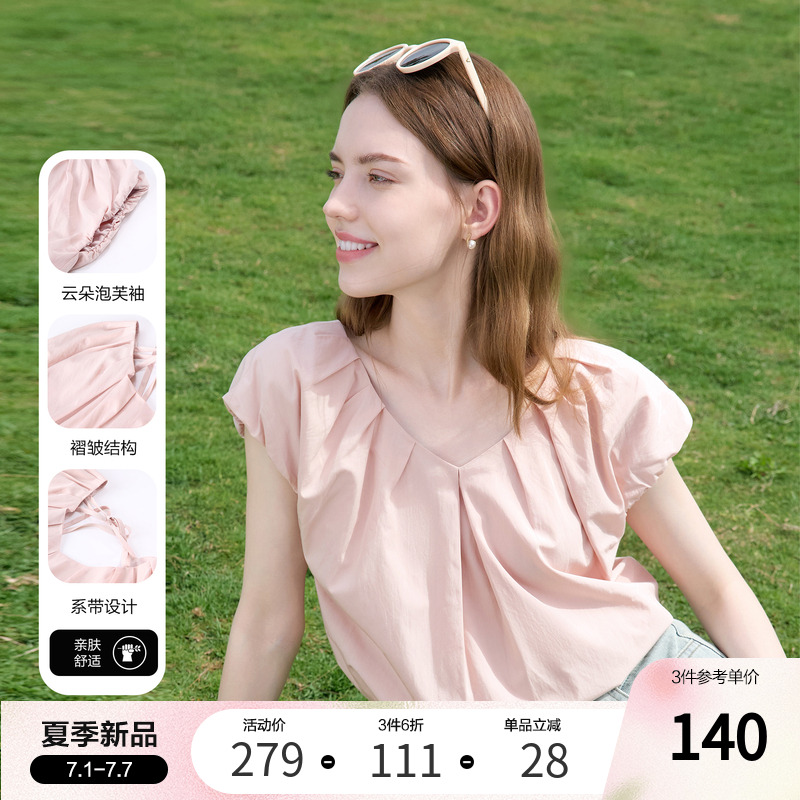 betu百圖粉色夏日泡芙云朵襯衫女2025年夏季新款后V領短袖襯衣