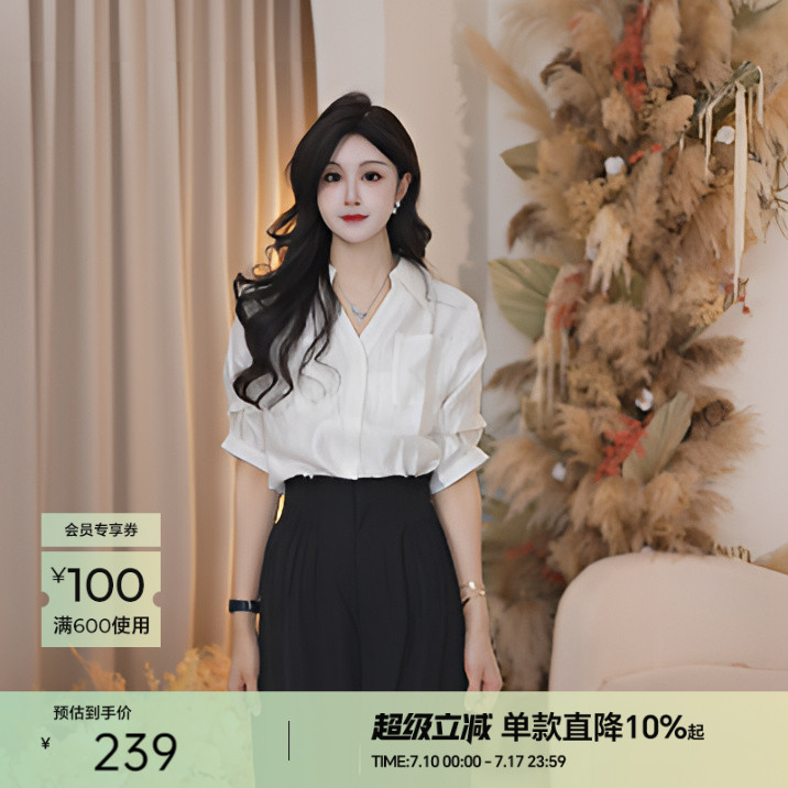 正品原版2025夏季新款時尚v領收腰洋氣減齡氣質百搭短袖女裝襯衫