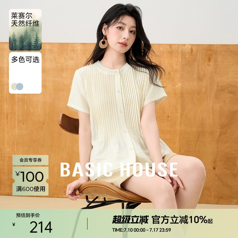 Basic House/百家好萊賽爾藍色短袖襯衫2025夏壓褶娃娃衫圓領上衣