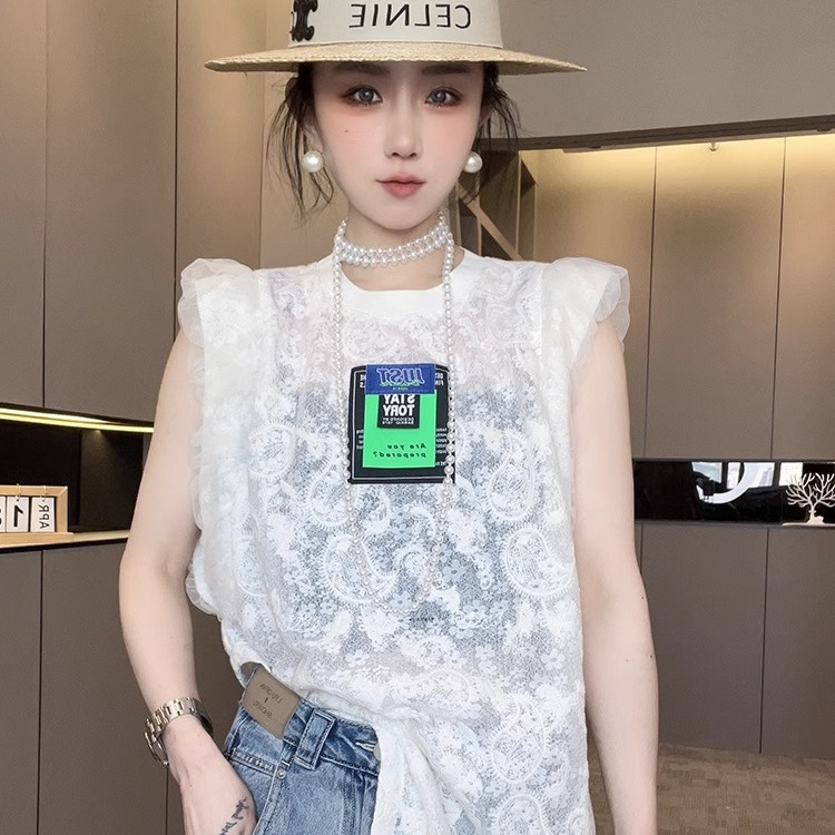 夏季新款薄款鉤花鏤空T恤小眾設計感氣質上衣女外搭大碼無袖馬夾