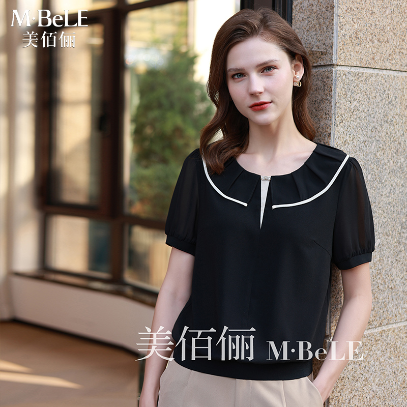美佰儷氣質V字撞色海軍領短袖T恤女夏2025新款小眾設計感雪紡上衣