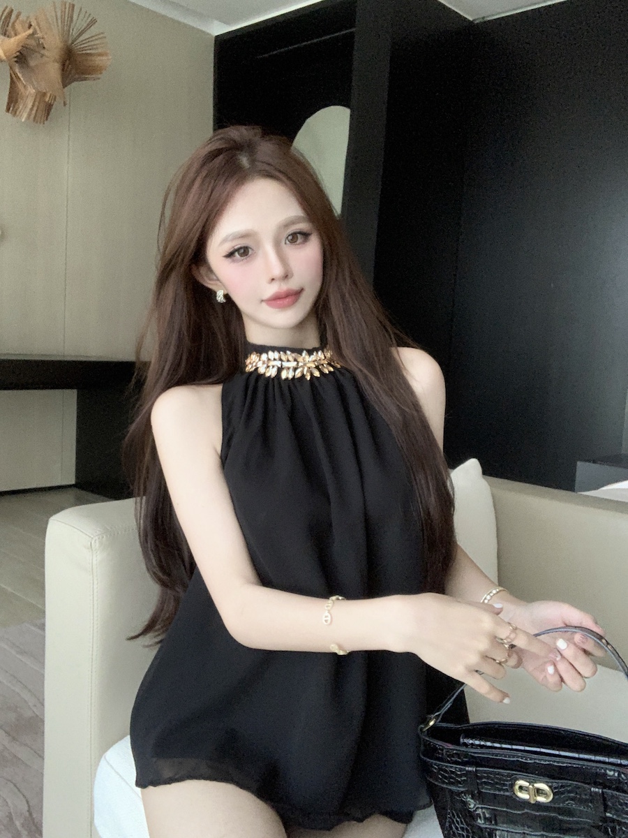 高級感鉆鏈無袖掛脖上衣女2024夏季新款辣妹寬松顯瘦簡約套頭小衫