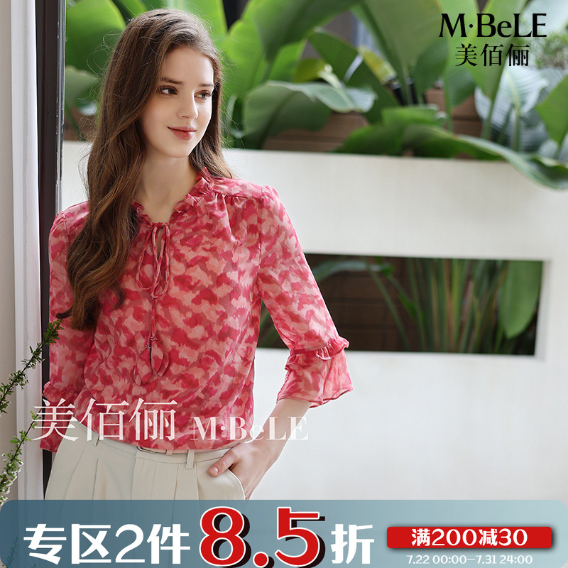 美佰儷2025年新款女裝印花小衫女氣質綁帶雪紡衫中袖寬松遮肚上衣
