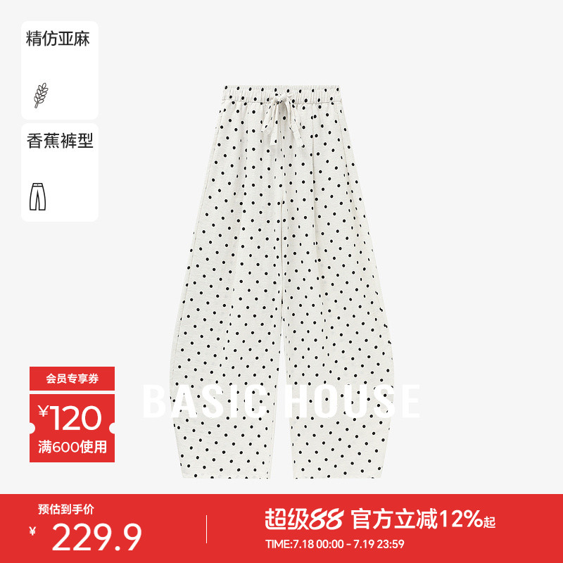 Basic House/百家好亞麻波點收腰闊腿褲女夏季流行撞色休閑長褲子