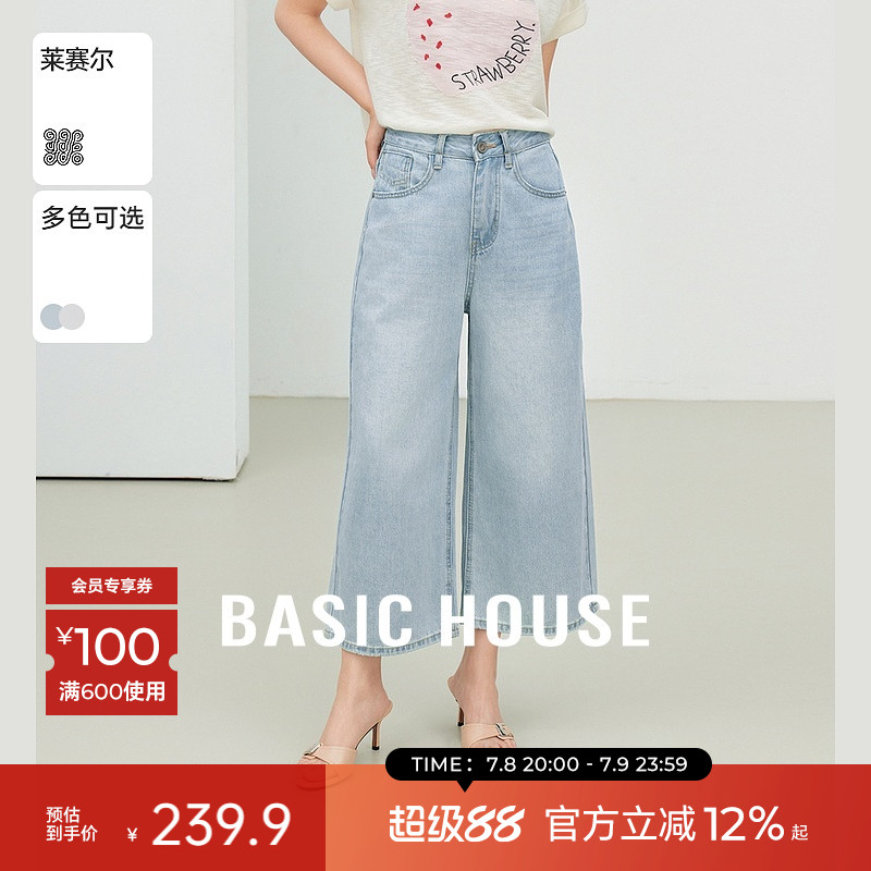 Basic House/百家好復古水洗直筒牛仔褲夏季顯瘦萊賽爾高腰八分褲