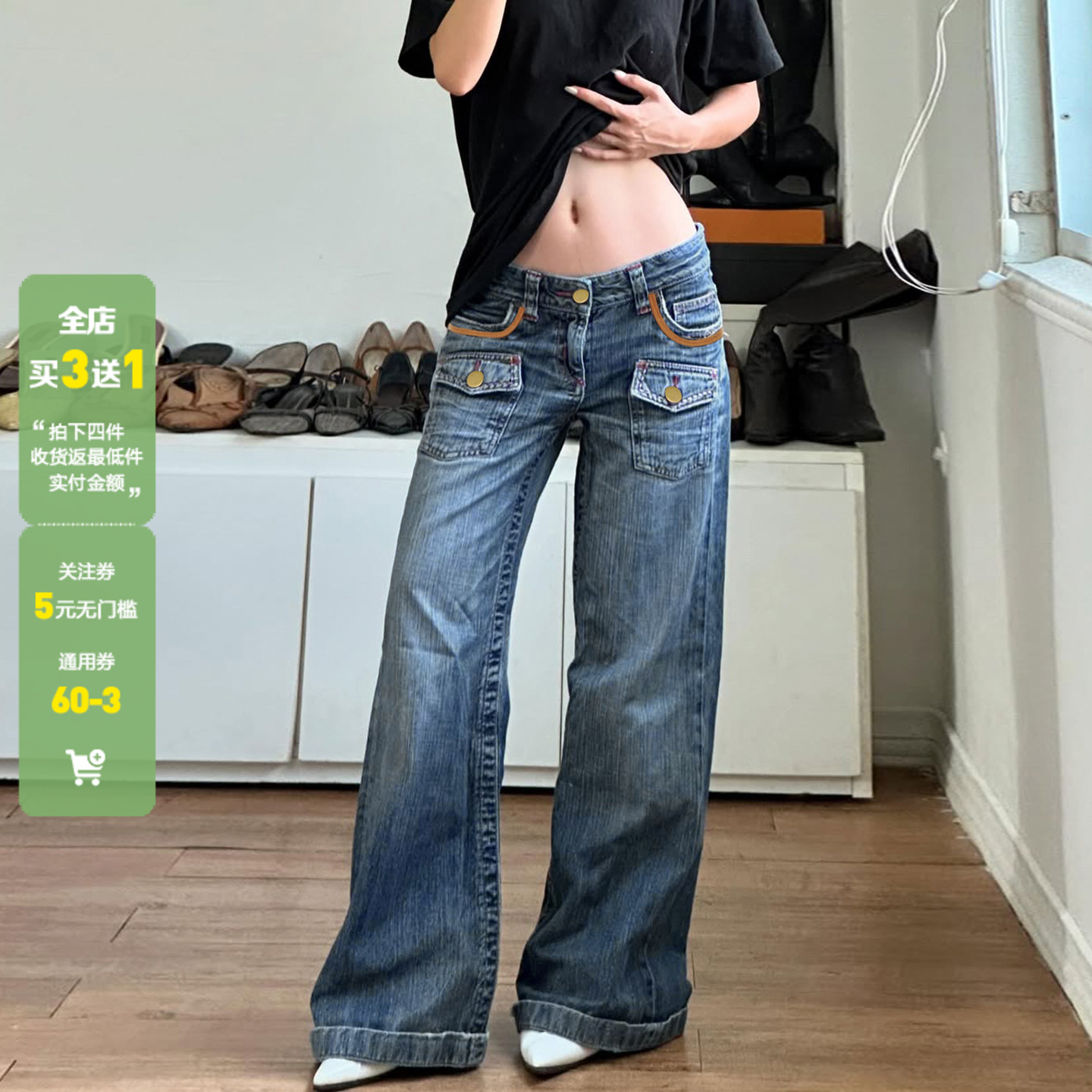 WEEKEEP 美式復古辣妹口袋設計水洗低腰牛仔褲女直筒寬松顯瘦長褲