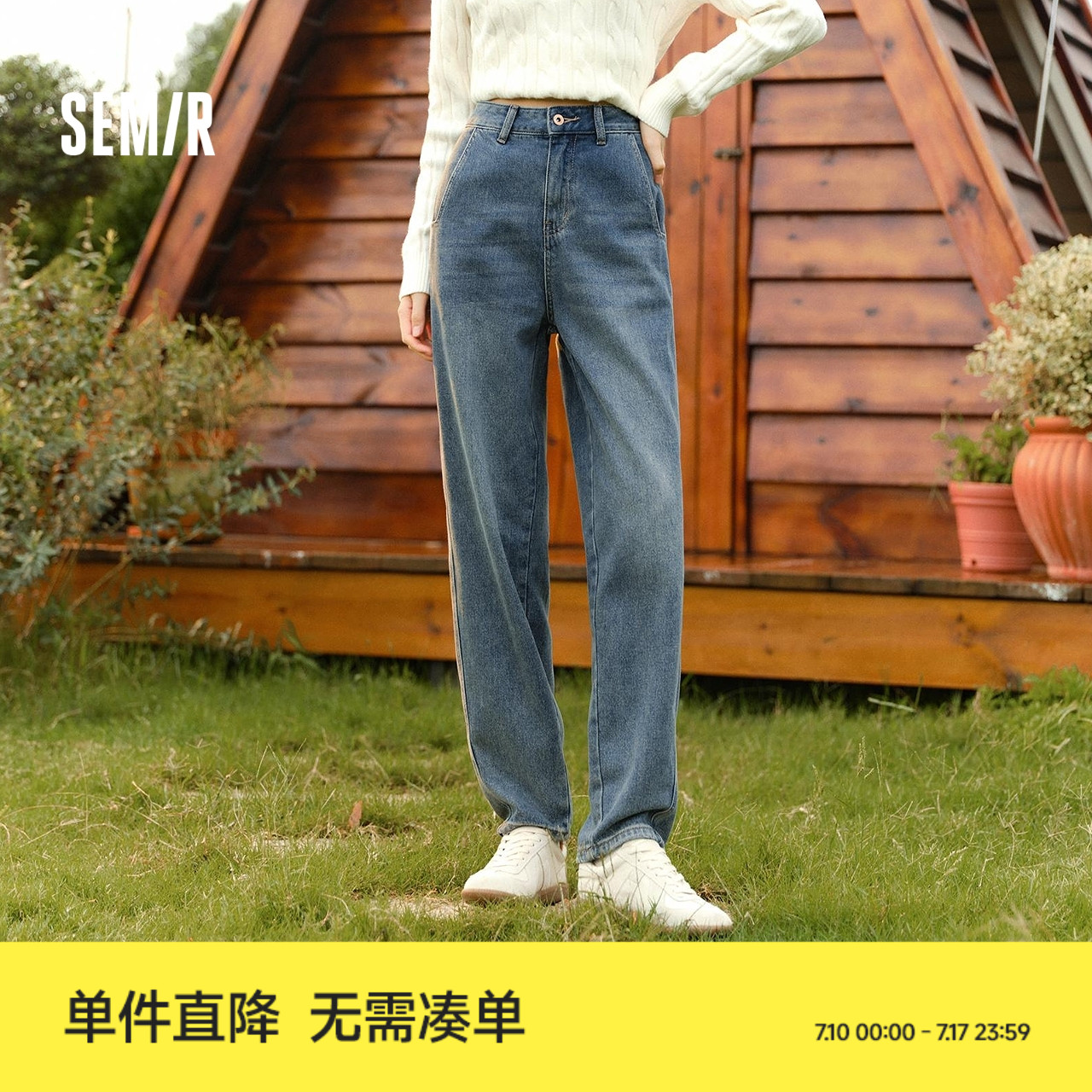森馬牛仔褲女抓毛長褲舒適復古風2024冬季新款潮流寬松錐形褲顯瘦