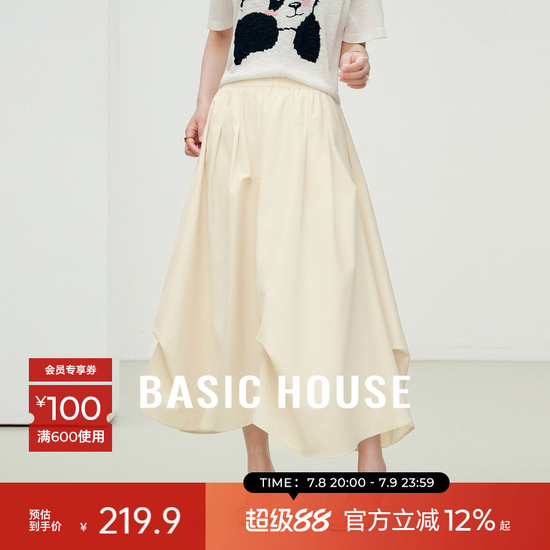 Basic House/百家好松緊腰純色半身裙女夏季新款堆疊不規則中長裙