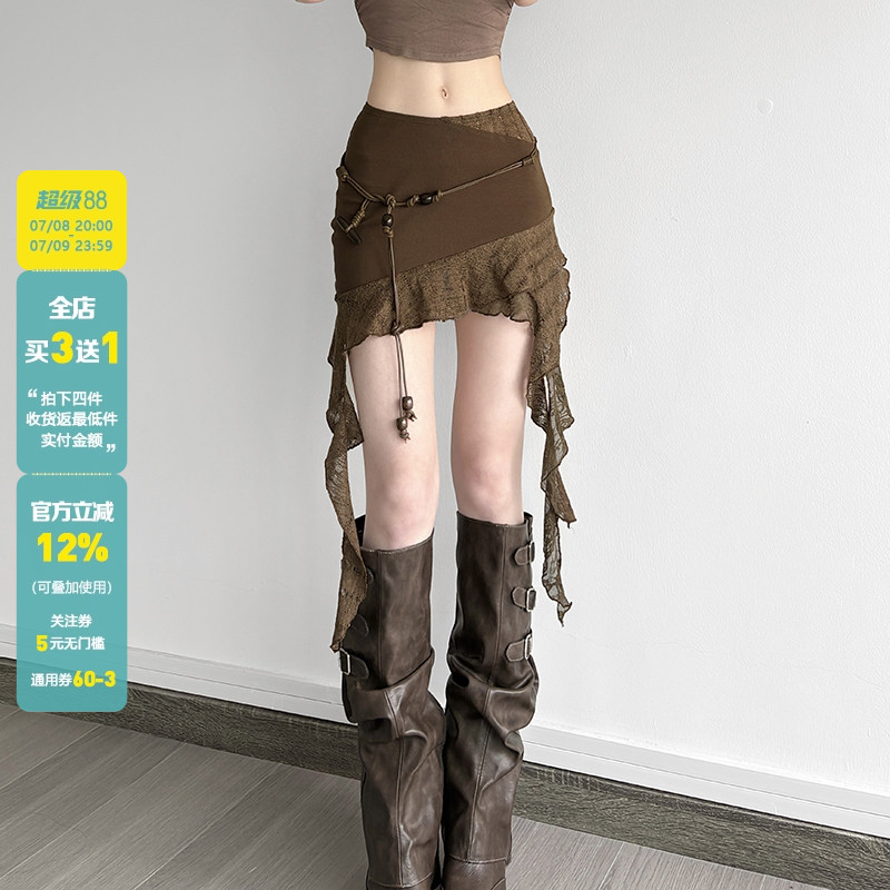 WEEKEEP 度假風復古不規則蕾絲拼接飄帶半身裙辣妹包臀低腰短裙