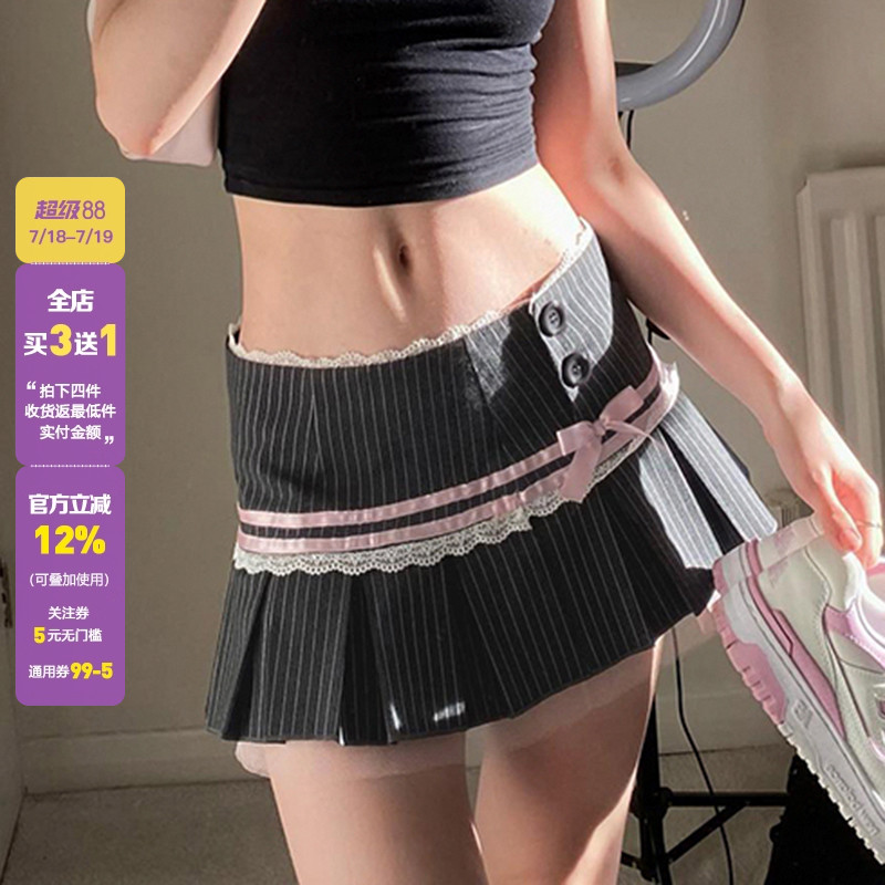WEEKEEP 法式芭蕾風撞色條紋蝴蝶結拼接半身裙女小眾蕾絲百褶短裙