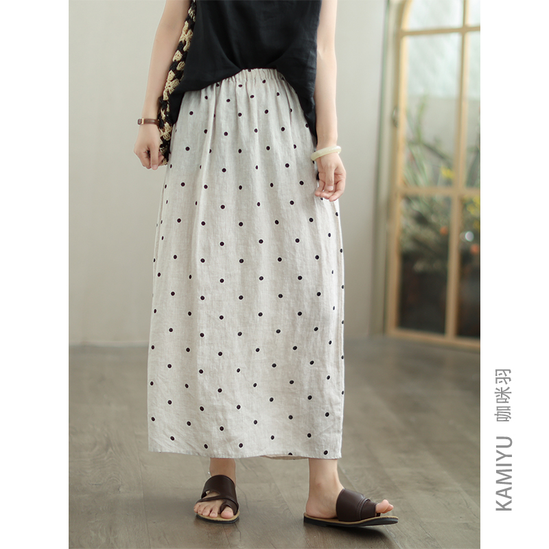 咖咪羽100%亞麻夏季新款裙子女波點寬松中長款松緊腰女裝半身裙女