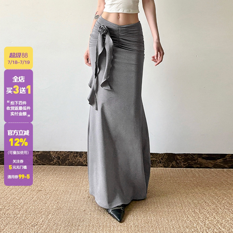 WEEKEEP 小眾氣質純色立體花朵飄帶低腰褶皺半身裙包臀魚尾長裙