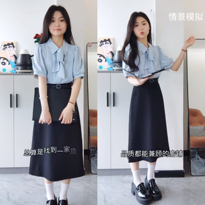 高貨藍色蝴蝶結襯衫女夏季2024新款大學生公務員教資面試正裝裙子