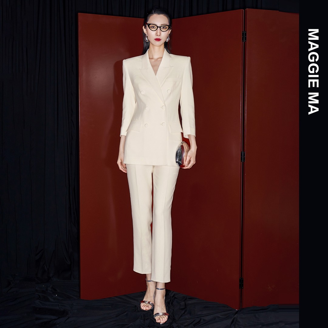 MAGGIE MA馬婧設計師款米白色干練氣質柔和西裝褲子套裝292C/298P