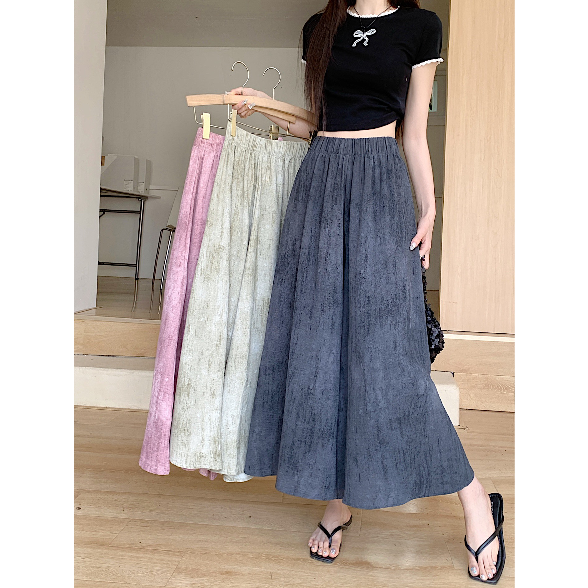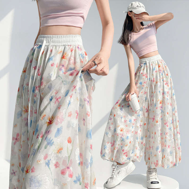 實拍 彩色花苞闊腿褲女夏季高腰垂感小個子直筒燈籠休閑冰絲裙褲
