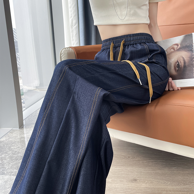 實拍現貨2025新款丹寧深藍色闊腿牛仔褲春夏季冰絲直筒拖地褲子
