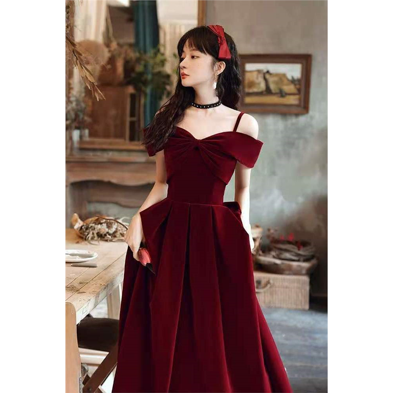 酒紅色敬酒服2025秋冬新款新娘氣質吊帶絲絨訂婚連衣裙女結婚禮服