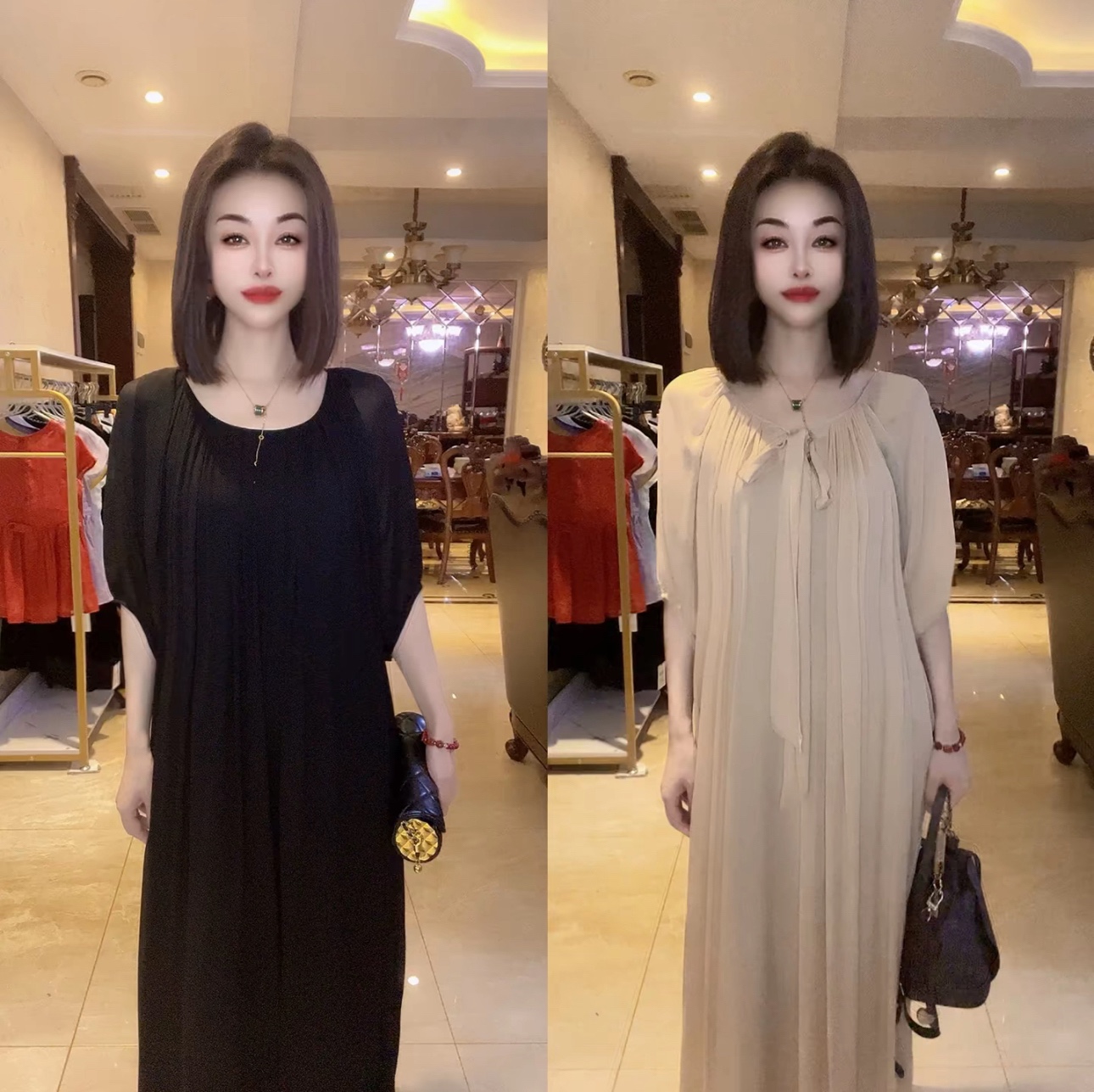 歐貨時尚高級感圓領雪紡紗寬松連衣裙女2025夏季新款顯瘦度假長裙