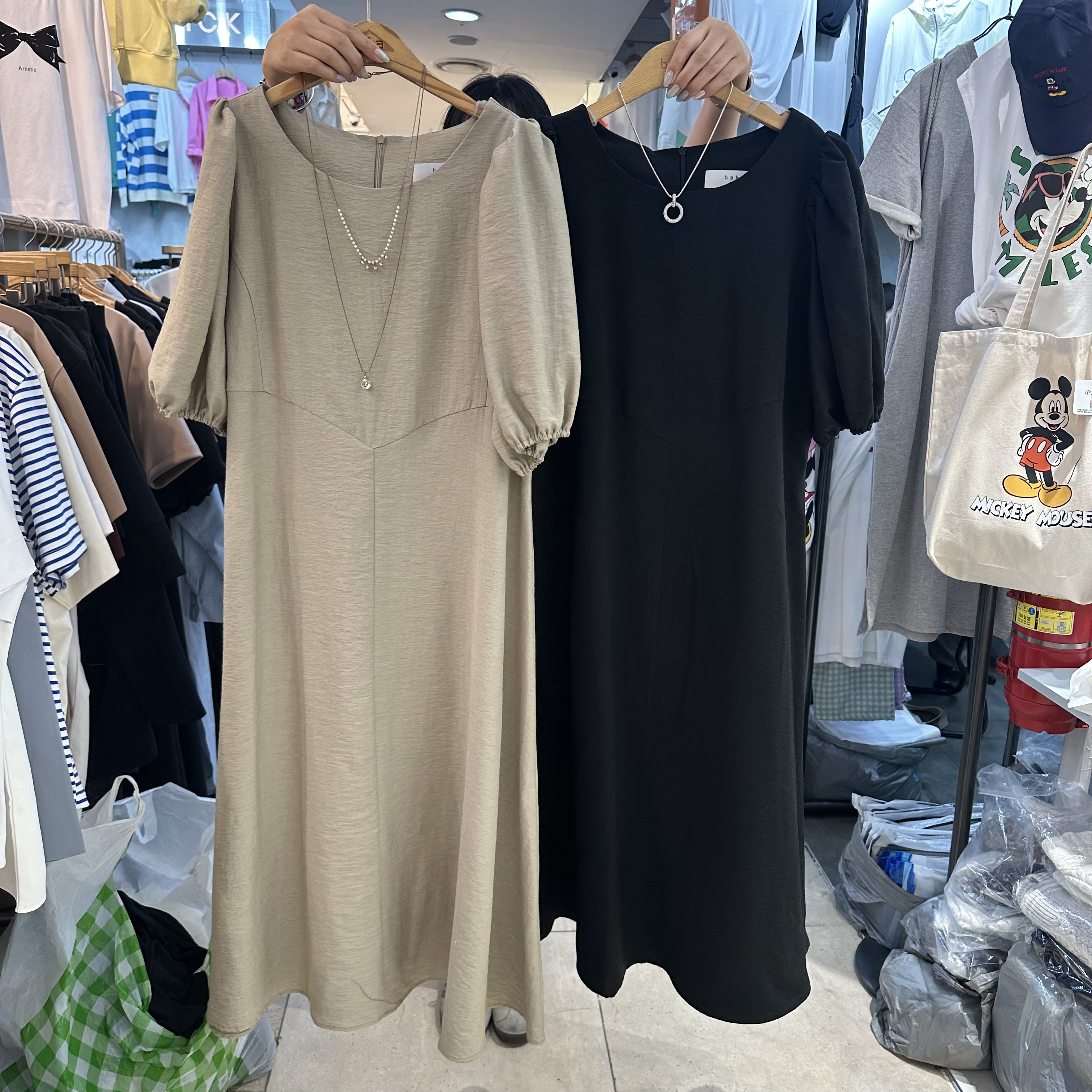 韓國代購大碼女裝2025夏季新款宮廷泡泡袖冰感長裙圓領純色連衣裙