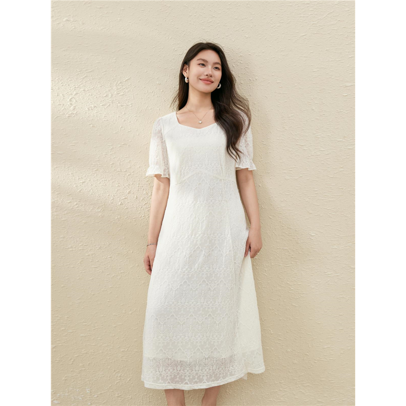 2025夏新款大碼女裝胖MM奶油鏤空小花方領荷葉邊連衣裙高腰中長裙