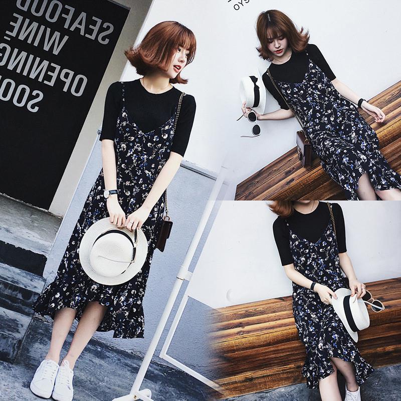 韓版2025春裝新款 荷葉邊中長款v領碎花吊帶連衣裙兩件套女夏
