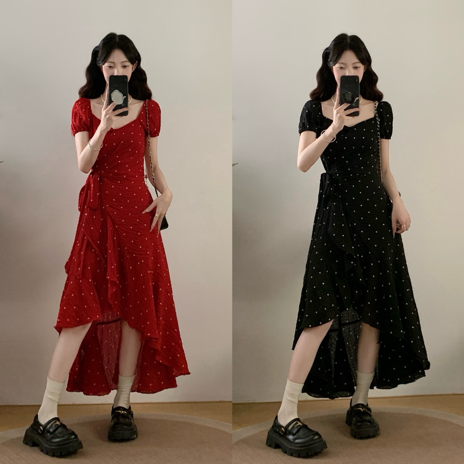 大碼胖mm今年超流行波點連衣裙女夏季新款約會穿搭氣質不規則長裙